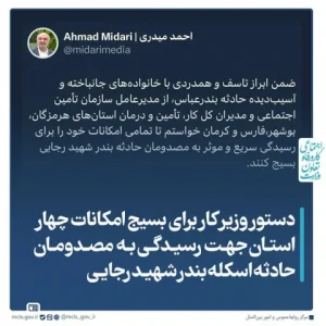 احمد میدری، وزیر تعاون، کار و رفاه اجتماعی، در پی حادثه اسکله بندر شهید رجایی بندرعباس ضمن ابراز تأسف و همدردی با خانوادههای آسیبدیدگان و تسلیت به خانواده جانباختگان طی تماسی با مدیرعامل سازمان تأمین اجتماعی و مدیران کل کار، تأمین اجتماعی و درمان استانهای هرمزگان، بوشهر، فارس و کرمان، دستور بسیج کامل امکانات این مجموعهها برای رسیدگی فوری و مؤثر به مصدومان را صادر کرد.