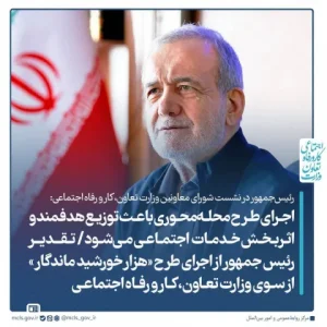 رئیسجمهور در نشست شورای معاونین وزارت تعاون، کار و رفاه اجتماعی: اجرای طرح محلهمحوری باعث توزیع هدفمند و اثربخش خدمات اجتماعی میشود / تقدیر رئیس جمهور از اجرای طرح «هزار خورشید ماندگار» از سوی وزارت تعاون، کار و رفاه اجتماعی