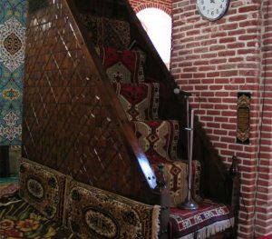 مسجد داراى منبری چوبى با هفت پله‌ بلند است که ۳٫۶ متر طول و ۲٫۱۰ متر ارتفاع دارد و در بالاى بخش شرقى آن نام واقف منبر با خط ثلث زیبا از چوب سفید منبت‌کارى شده است.